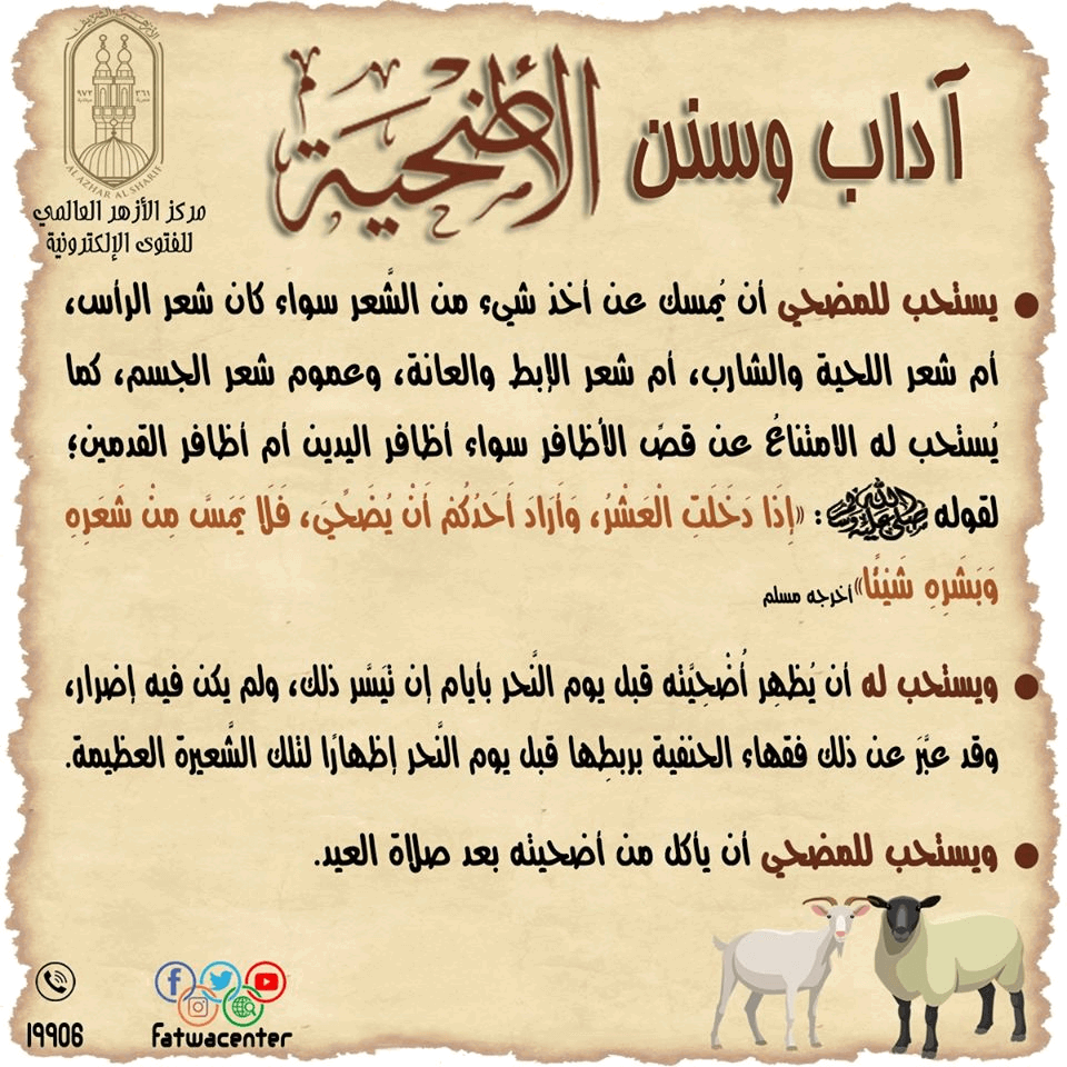 أوضح مركز الأزهر للفتوى عبر الصفحة الرسمية على موقع «فيسبوك»، أنه من أراد ذبح الأضحية أيام عيد الأضحى عليه القيام بعدة أمور هي: